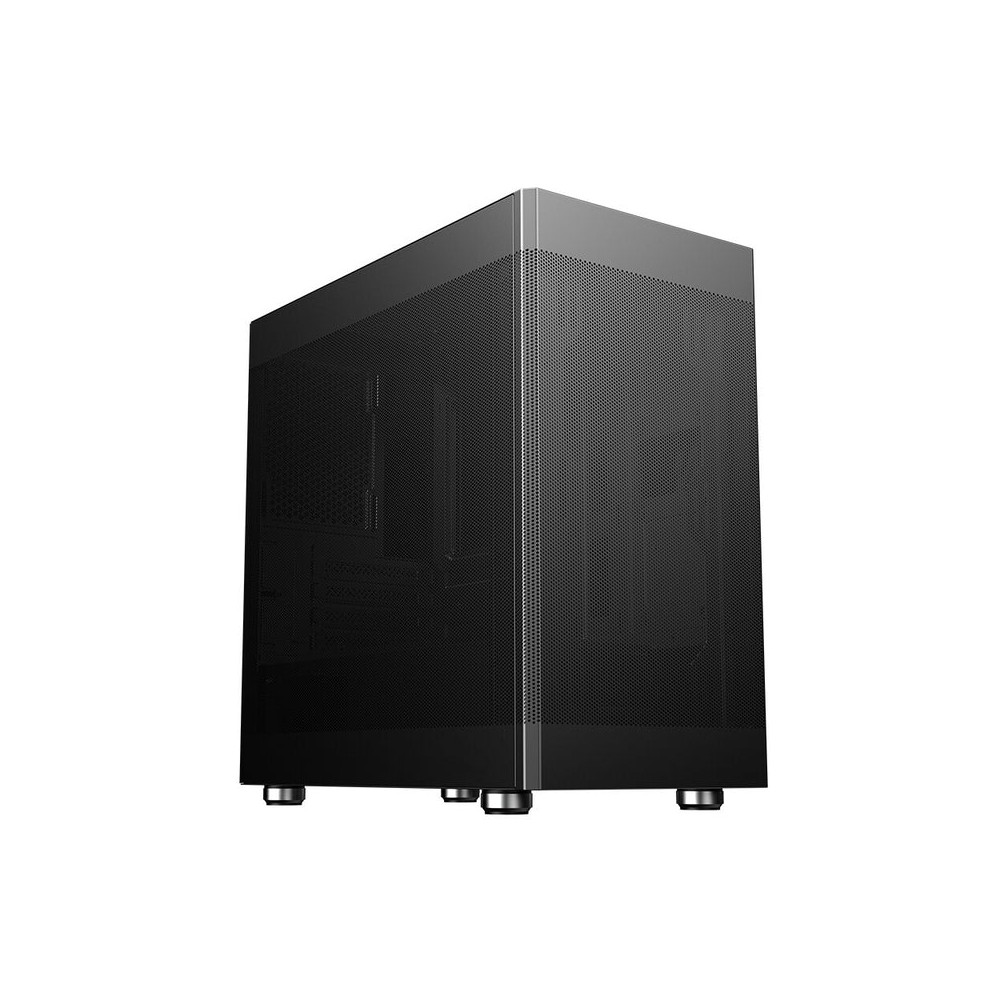 Itek PROMESH 35 è stato progettato per soddisfare gli utenti che necessitano di assemblare una build con grande facilità, un eccellente air flow ed esteticamente moderna. PROMESH può essere usato sia per sistemi office che gaming, questo il motivo per cui viene proposto senza ventole all'interno, lasciando all'utente la scelta di quante e quali installarne, con o senza RGB ecc. Questo cabinet è davvero versatile e professionale, le paratie laterali e quella frontale sono completamente traforate per permettere il miglior flusso d'aria possibile. La struttura è in grado di ospitare schede video di ultima generazione di lunghezza fino a 345mm, dissipatori alti 160mm, liquid cooling fino a 240mm, diverse ventole aggiuntive e il cable management è di 25mm. Sulla parte superiore troviamo i collegamenti audio, 2 porte USB 3.0 e una Type-C