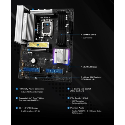 La ASRock B860 Pro RS WiFi è una motherboard basata su chipset Intel B860 progettata per sfruttare le nuove piattaforme Intel con socket LGA1851.