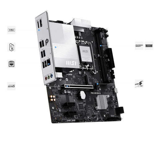 La MSI PRO H810M-B DDR5 è una scheda madre Micro-ATX con chipset Intel H810 e socket LGA1851 pensata per build economiche e moderne. Supporta CPU Intel Core Ultra, integra memoria DDR5, slot PCIe 4.0 x16, storage M.2 NVMe e connettività essenziale per PC da ufficio e gaming entry-level.