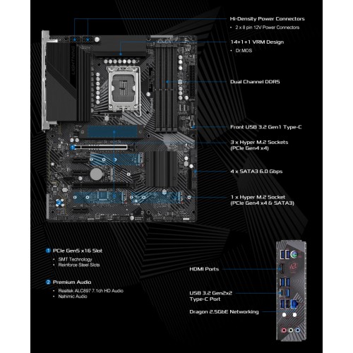 La connettività di rete è affidata alla Realtek 2.5G LAN (Dragon RTL8125BG), pensata per gaming online e trasferimenti verso NAS senza colli di bottiglia. L’audio è un 7.1 canali HD con codec Realtek ALC897 e tecnologia Nahimic, per un suono più pulito in cuffia e sugli impianti multicanale. Sul pannello I/O trovi USB 3.2 Gen2x2 Type-C, USB 3.2 Gen2 e Gen1, più le uscite video HDMI per sfruttare l’iGPU dei processori Intel.